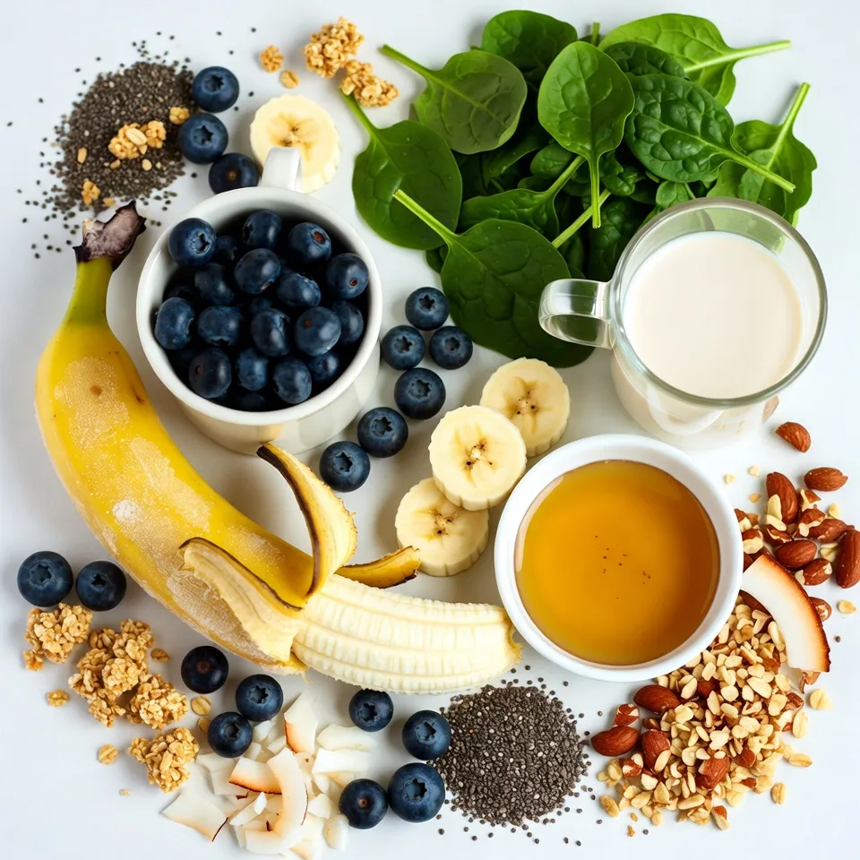 To make the base, start by gathering your ingredients. You need one frozen banana, one cup of blueberries, half a cup of spinach, one cup of almond milk, and sweetener if you like. Place these in your blender. The frozen banana helps make the smoothie cold and thick. Fresh or frozen blueberries add natural sweetness and color.