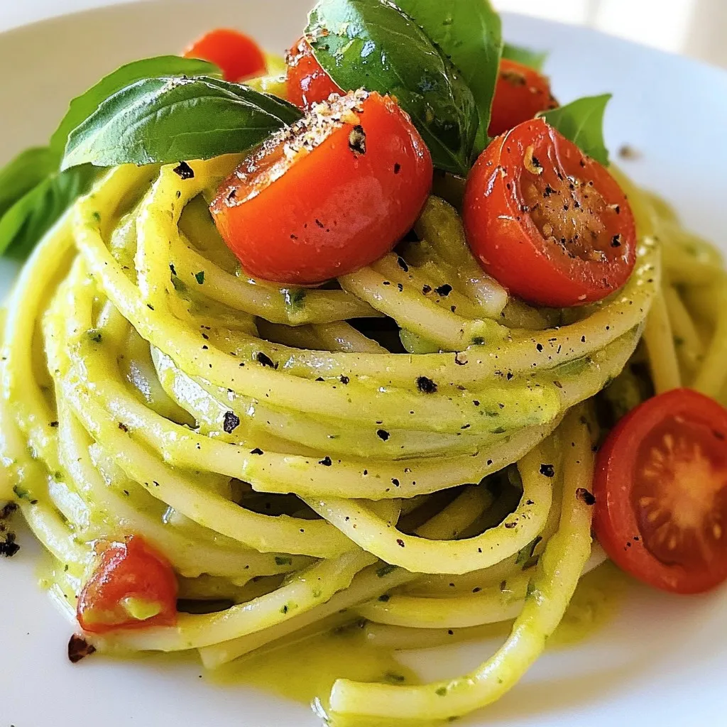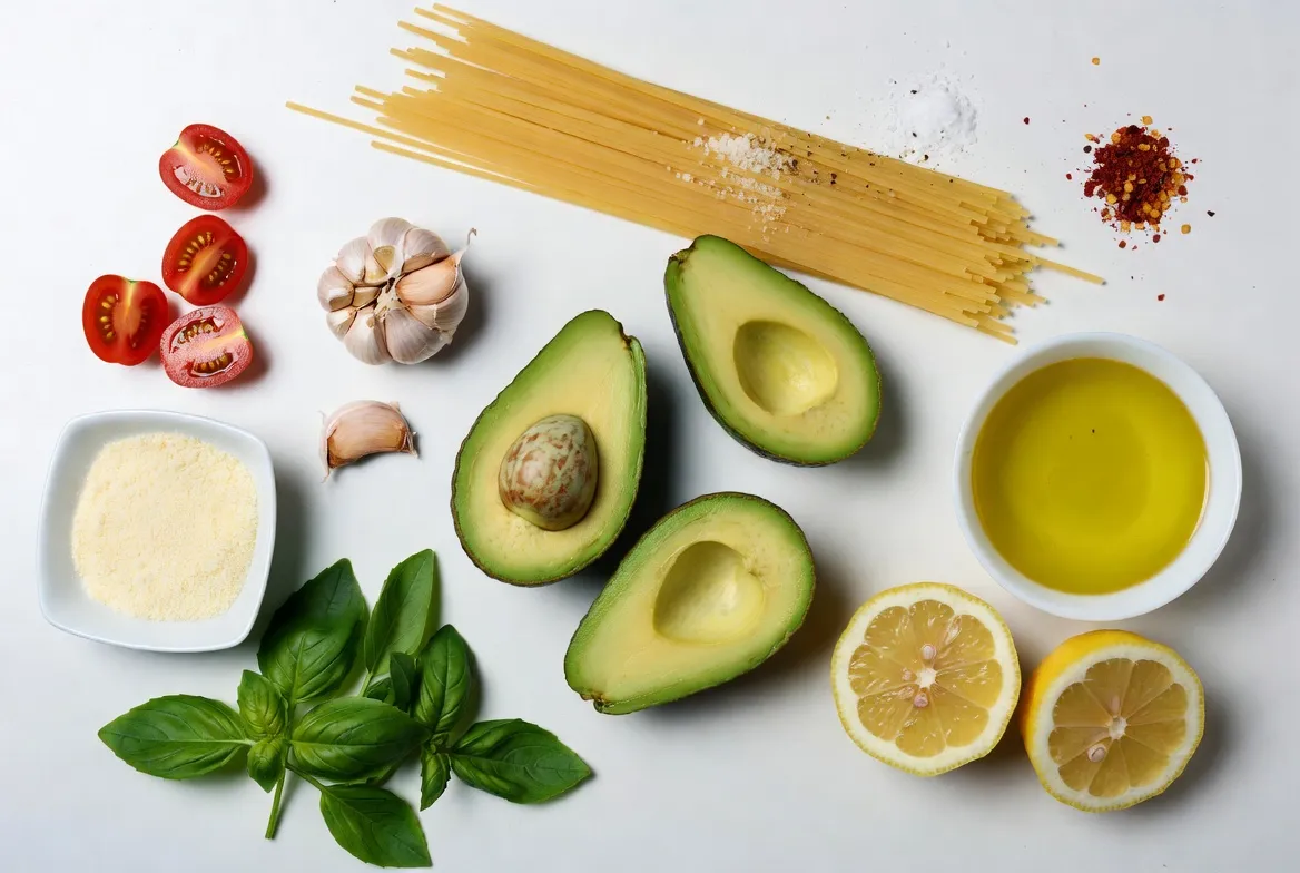These main ingredients create a rich and creamy pasta sauce. The ripe avocados add a smooth texture. Garlic gives a nice kick, while basil adds fresh flavor. Lemon juice brightens the dish, and olive oil makes it silky.