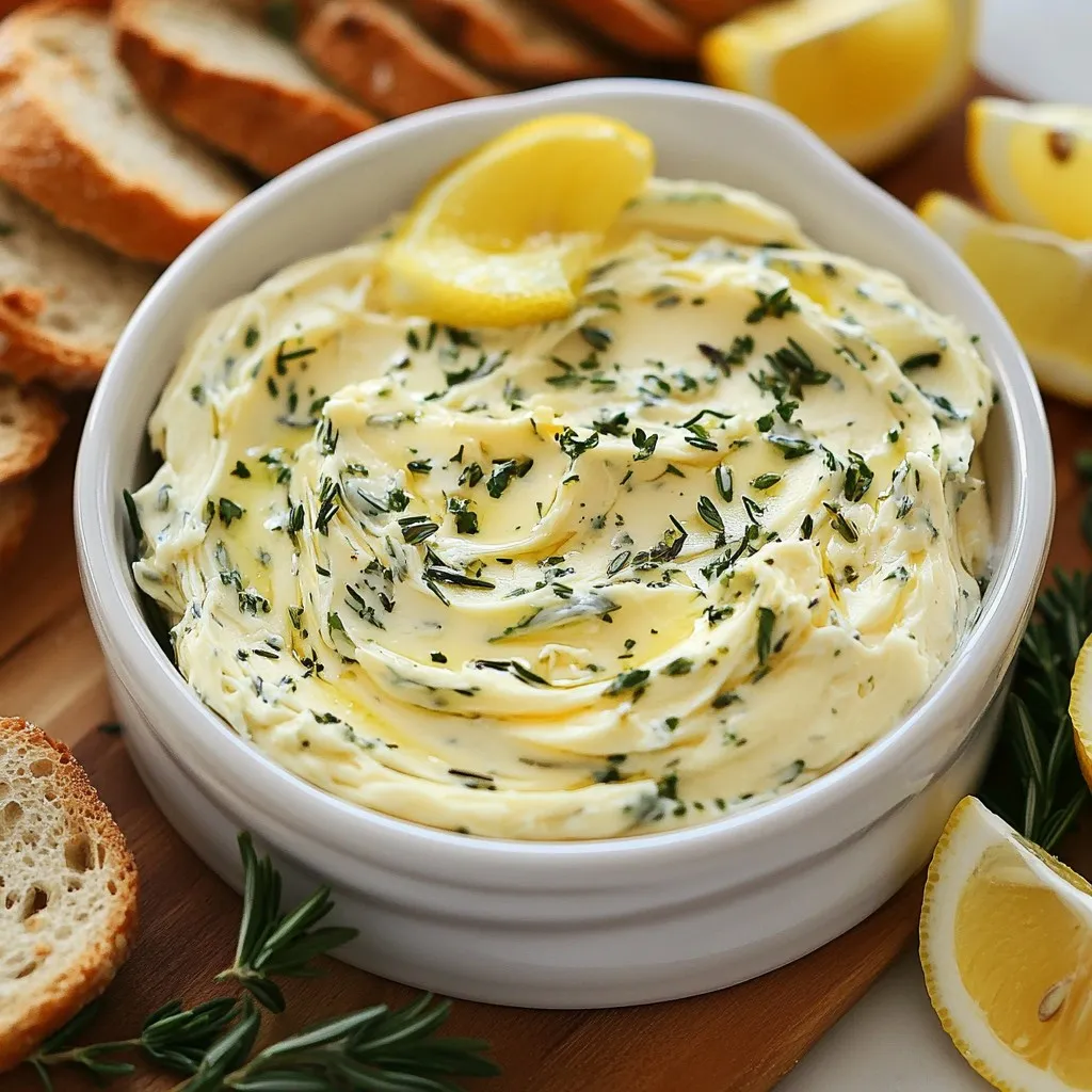 For an eye-catching display, sprinkle fresh herb leaves around the garlic herb butter and nestle a few lemon wedges beside it for a vibrant splash of color.