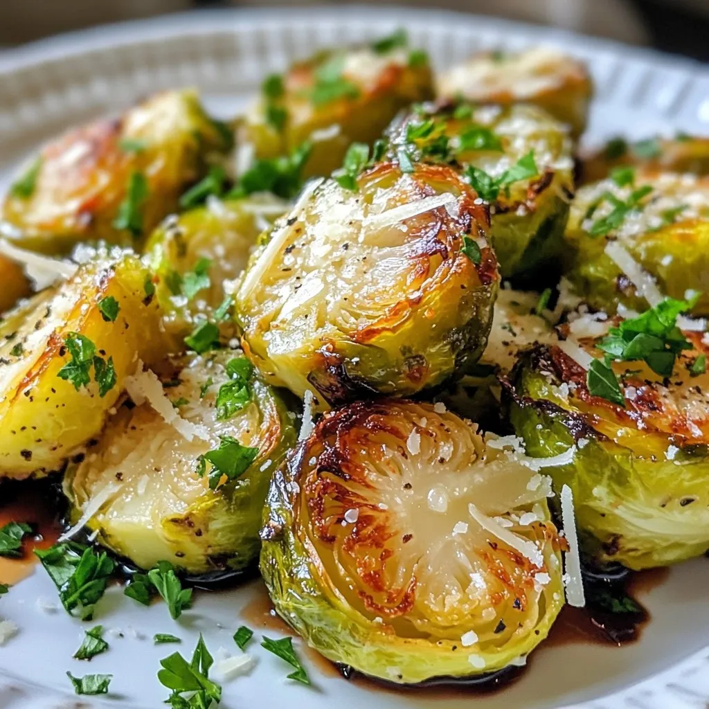 A delicious roasted Brussels sprouts dish with garlic, Parmesan cheese, and a hint of balsamic glaze.