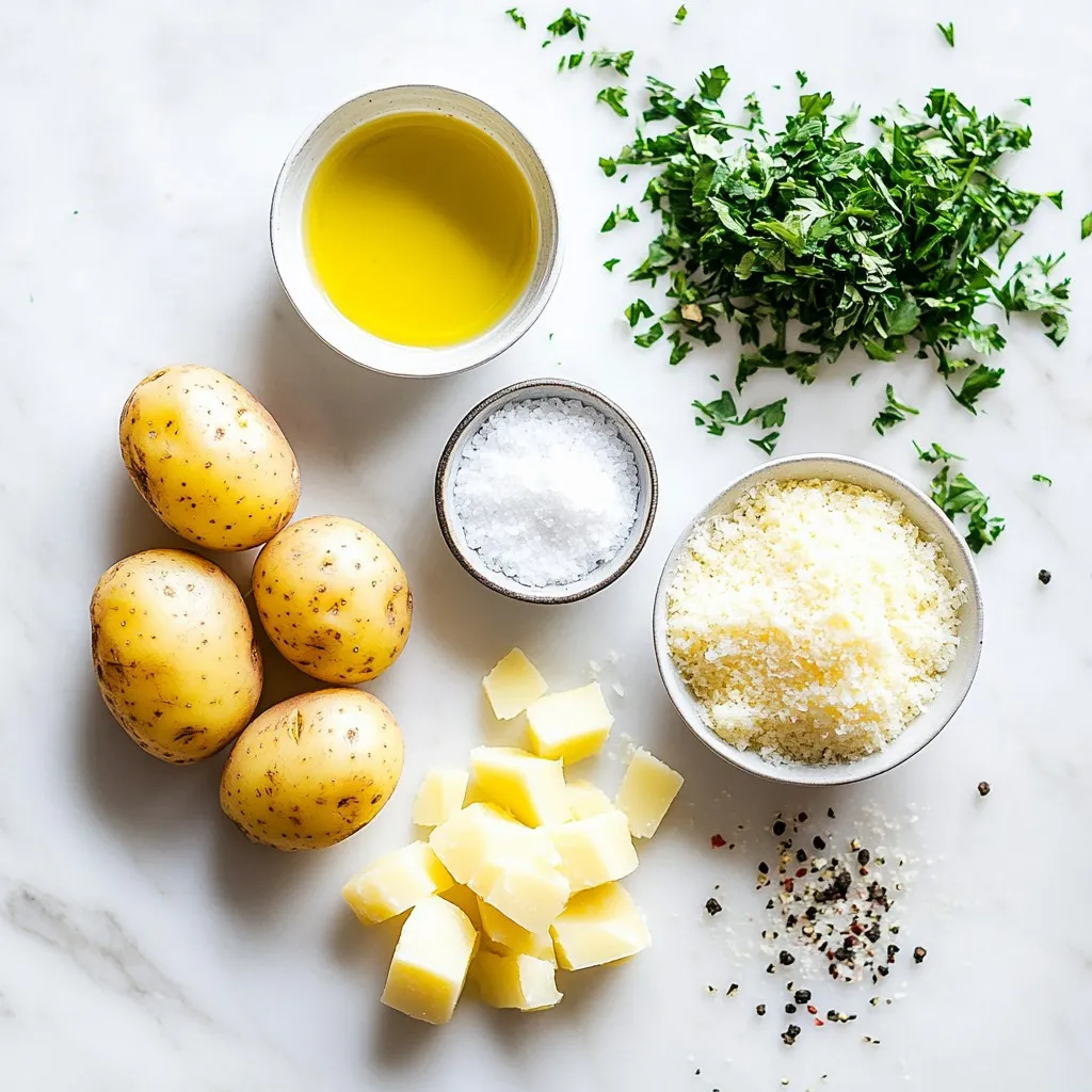 The main ingredients for Garlic Parmesan Roasted Potatoes are simple yet flavorful. You need baby potatoes for a nice bite. I love using 2 pounds because they roast well and get crispy. Garlic adds that rich, savory taste. Four cloves finely minced will make the flavor pop. Parmesan cheese gives a cheesy, salty kick. A 1/4 cup freshly grated will melt beautifully on the hot potatoes. Olive oil is key too; I use 3 tablespoons to coat the potatoes and help them brown nicely.