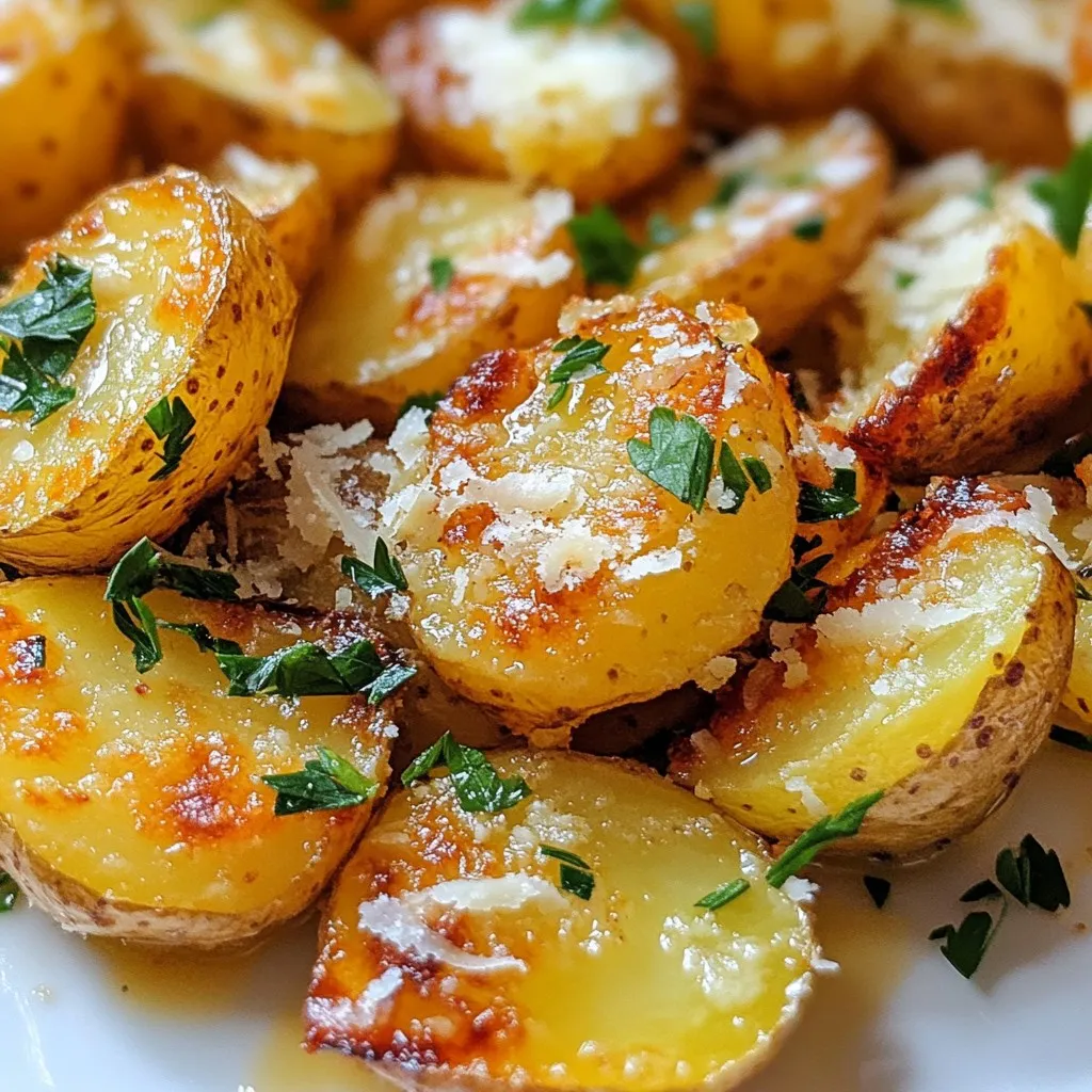Deliciously crispy roasted baby potatoes with garlic and Parmesan cheese.