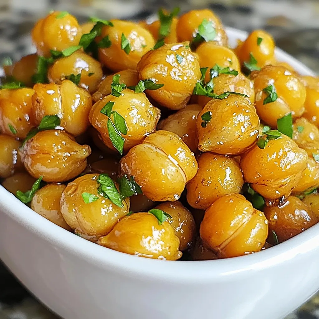 Crispy roasted chickpeas coated in a sweet and savory honey garlic mixture, perfect as a snack or salad garnish.