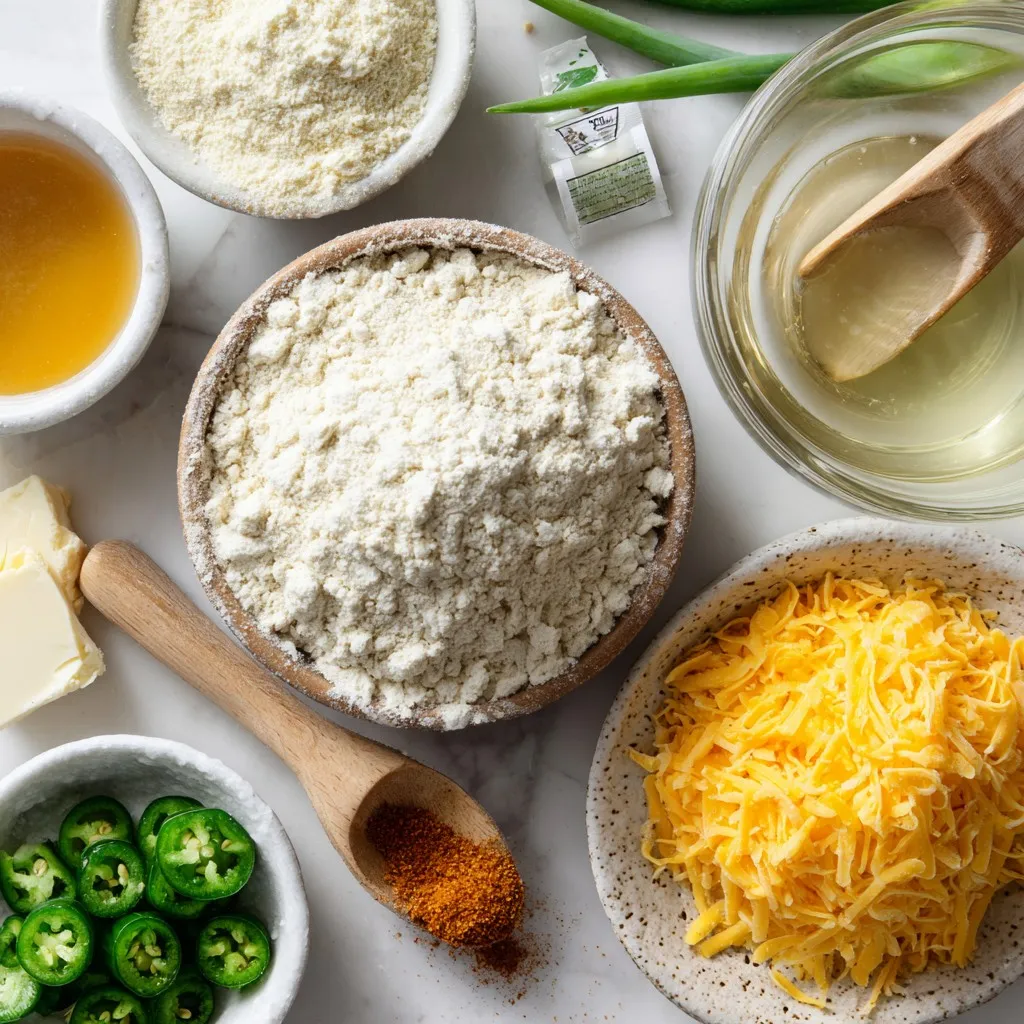 When making jalapeño cheddar stuffed pretzels, you need to gather all these ingredients first. The flour is the base for the dough. Yeast makes the dough rise and gives it a soft texture. Sugar helps the yeast work better. Salt adds flavor to the dough.