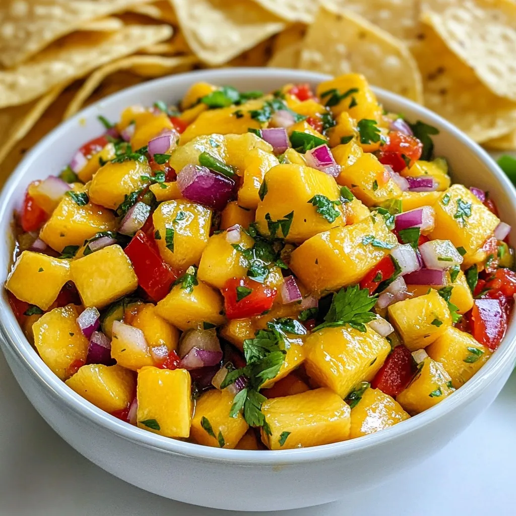 A vibrant and fresh salsa made with ripe mango, bell pepper, and cilantro, perfect for pairing with tortilla chips or grilled dishes.