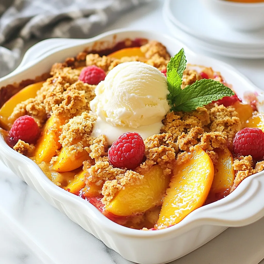 A delightful dessert featuring ripe peaches and fresh raspberries topped with a crunchy crumble.