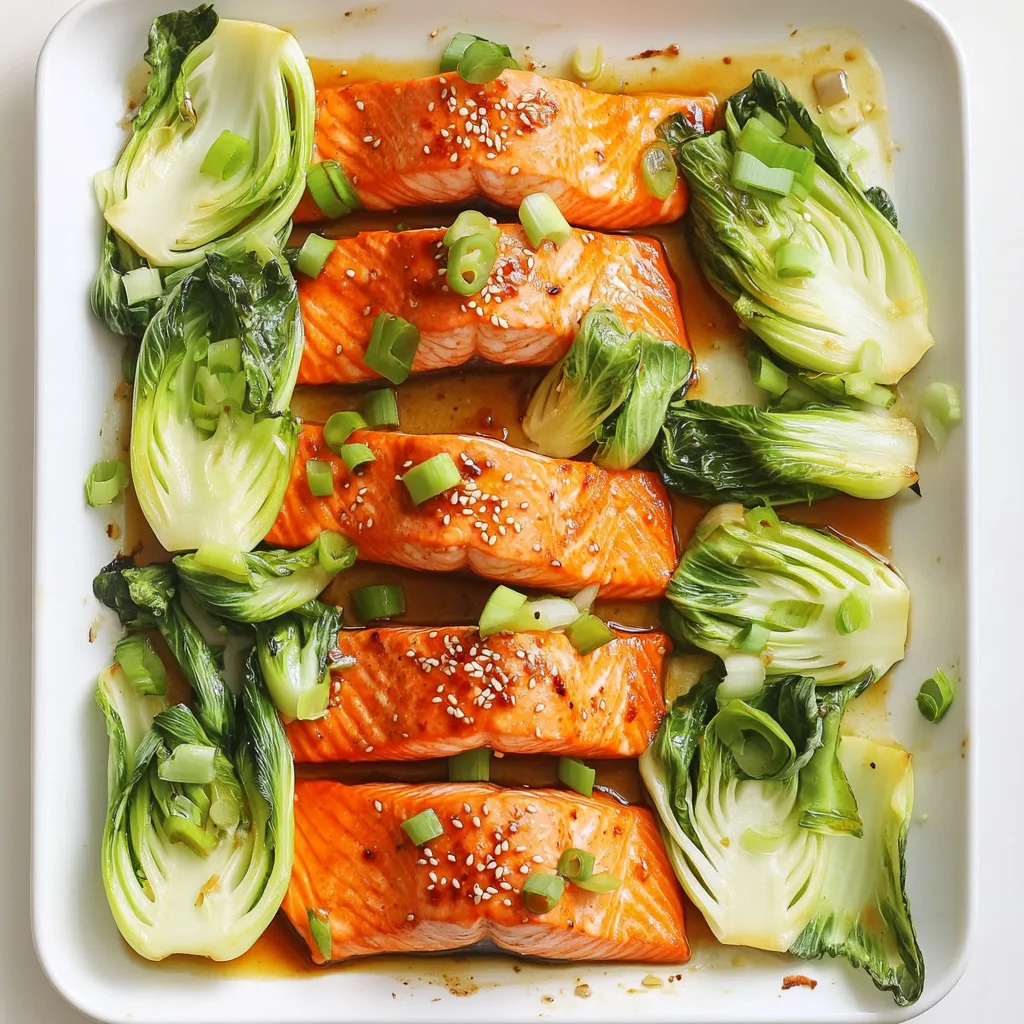 Delight in the flavors of Sheet-Pan Sesame Ginger Salmon and Bok Choy! This easy recipe features tender salmon fillets paired with perfectly roasted bok choy, all infused with a tasty sesame ginger marinade. In just 25 minutes, impress your family with this healthy dish that's simple to make and clean up! Ready to cook up something delicious? Click through for the full recipe now! #SheetPanDinner #HealthyEating #SalmonRecipe #BokChoy
