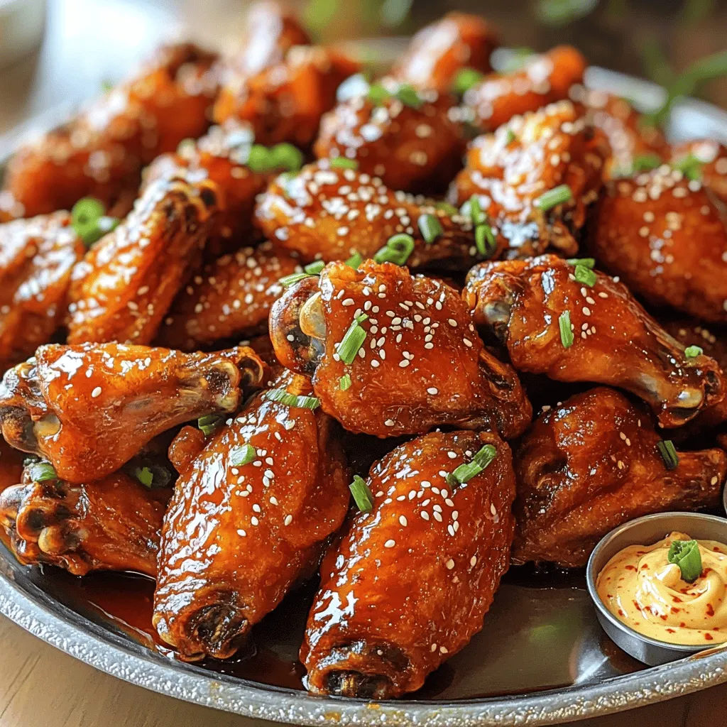 - 2 pounds chicken wings - 2 tablespoons gochujang (Korean chili paste) - 1 tablespoon soy sauce - 2 tablespoons honey - 1 tablespoon rice vinegar - 2 cloves garlic, minced - 1 teaspoon ginger, freshly grated - 1 tablespoon sesame oil - 2 tablespoons sesame seeds (toasted) - 2 green onions, finely chopped - Salt and freshly ground black pepper to taste When you want to make spicy Korean chicken wings, start with fresh ingredients. The chicken wings are the star. You need two pounds for a good meal. Next, gochujang is a must. This Korean chili paste gives heat and depth. You will also need soy sauce to add saltiness and umami. For sweetness, use two tablespoons of honey. This balances the spice. Rice vinegar adds a tangy kick. You want two tablespoons of that too. Don’t forget garlic! Mince two cloves to boost the flavor. Fresh ginger brings warmth, so use a teaspoon of that as well. Now, let’s not skip the finishing touches. Sesame oil adds a rich, nutty taste. You want one tablespoon. Toasted sesame seeds give crunch and flavor, so add two tablespoons. Finally, green onions add freshness and color. Finely chop two for garnish. Don’t forget to add salt and black pepper to taste! Gather these ingredients, and you are ready to create something delicious. Enjoy the process! 1. Preheat your oven to 400°F (200°C). 2. Line a baking sheet with aluminum foil. 3. Place a wire rack on top of the foil. This helps the wings get crispy. 4. In a large bowl, mix together: - 2 tablespoons gochujang - 1 tablespoon soy sauce - 2 tablespoons honey - 1 tablespoon rice vinegar - 2 cloves garlic, minced - 1 teaspoon ginger, freshly grated - 1 tablespoon sesame oil - Salt and black pepper to taste. 1. Add the chicken wings to the marinade. 2. Make sure each wing gets a good coat. 3. For best flavor, let them marinate for at least 30 minutes. 4. If you can, let them sit in the fridge for a few hours or overnight. 1. Arrange the wings in a single layer on the wire rack. 2. Leave space between each wing for even cooking. 3. Place the baking sheet in the oven and bake for 45 minutes. 4. Halfway through, flip the wings with tongs. This helps them get crispy and golden. 5. After 45 minutes, your wings should look crispy and delicious. 6. Take them out and let them rest for 5 minutes. 7. Before serving, sprinkle toasted sesame seeds and chopped green onions on top for extra flavor and color. To make your wings crispy, air circulation is key. This allows heat to reach all sides. Use a wire rack on your baking sheet. It lifts the wings, letting hot air flow all around. This method prevents sogginess and ensures crispy skin. Marinate your wings for at least 30 minutes. This lets the flavors soak in. If you can, marinate them overnight. You can also add extra spices. Try chili flakes for more heat or smoked paprika for a deeper flavor. For a great presentation, use a colorful platter. Arrange the wings neatly and sprinkle sesame seeds and green onions on top. This adds color and crunch. Pair the wings with dipping sauces. Options like spicy mayo or extra gochujang enhance the flavor. {{image_4}} If you love heat, you can amp up the spice in your wings. Increase the amount of gochujang for a bolder kick. Start with 3 tablespoons instead of 2. You can also add chili flakes to the marinade. Just sprinkle in a teaspoon or more, depending on your taste. Another great choice is to use spicy sesame oil instead of regular. This gives your wings a fiery twist. You can change how you cook your wings for different flavors. Grilling is one option. It adds a nice smoky taste to the wings. Just marinate as usual and toss them on a hot grill. Cook until crispy and charred. If you want a healthier option, try air frying. Preheat your air fryer, then cook the marinated wings. This method gives you crispy wings without using too much oil. It's quick and easy too! Feel free to swap out some ingredients for fun variations. Instead of honey, use brown sugar or agave syrup. Both will add sweetness and work well in the marinade. You can also explore other Korean marinades. Try using a bulgogi marinade for a different flavor. This could add a rich, savory depth to your wings. Experiment with what you like best! To keep your spicy Korean chicken wings fresh, store them in the fridge. Place the wings in an airtight container. This helps keep them moist. If you don’t have a container, wrap them tightly in plastic wrap. Try to eat the wings within three to four days for the best taste. When it's time to enjoy your leftover wings, reheating properly is key. To keep them crispy, use the oven. Preheat your oven to 375°F (190°C). Arrange the wings on a baking sheet. Bake them for about 10-15 minutes. This method helps restore their crunch. If you're in a hurry, you can use a microwave. Just remember, the wings may not stay crispy. If you want to save wings for later, freezing is a great option. First, let the wings cool completely. Then, place them in a freezer-safe bag. Make sure to remove as much air as possible before sealing. When you’re ready to eat, thaw the wings in the fridge overnight. Reheat them in the oven following the same steps as above for best results. This way, they stay delicious! Gochujang is a popular Korean chili paste. It has a thick texture and a deep red color. The taste is spicy, sweet, and savory, adding depth to any dish. You use it in marinades, sauces, or dips. It shines in recipes like spicy Korean chicken wings. The rich flavor enhances the wings, making them exciting and tasty. Yes, you can use other chicken parts. Chicken thighs and drumsticks work well too. They have more fat, which makes them juicy. You can follow the same marinade and cooking steps. Just remember to check the cooking time, as these parts may need a bit longer. There are many great side dishes for Korean chicken wings. Here are some ideas: - Coleslaw: The crunch balances the spicy wings. - Rice: Steamed rice soaks up the sauce well. - K