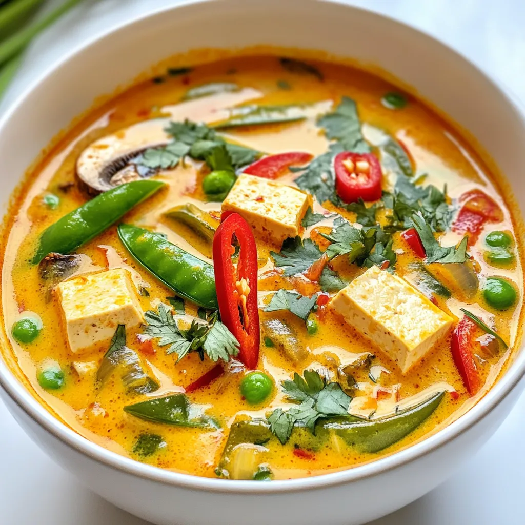 The base of this soup is creamy coconut milk. It gives a rich and smooth texture. Vegetable broth adds depth and flavor. Firm tofu brings protein and a satisfying bite.