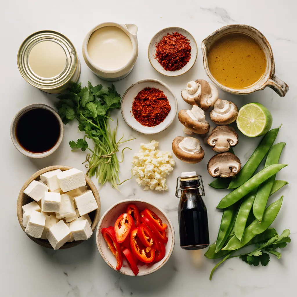 Red curry paste is key for that spicy kick. Fresh ginger and garlic bring warmth and zest. Mushrooms give a hearty feel, while bell pepper and snap peas add color and crunch.