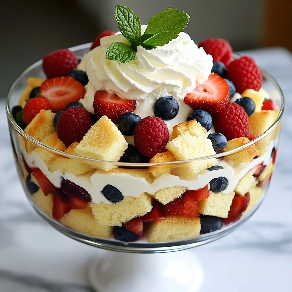 A refreshing and layered dessert featuring mixed berries, sponge cake, custard, and whipped cream.