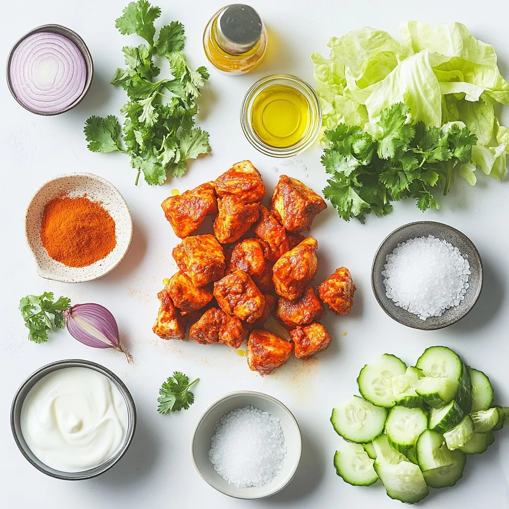 - 2 boneless chicken breasts - 4 tablespoons tandoori spice mix - 1 cup plain yogurt - 1 tablespoon garlic paste - 1 tablespoon ginger paste - 1 tablespoon fresh lemon juice - 1 tablespoon olive oil - 1 teaspoon salt - 1 head of iceberg or butter lettuce - 1 cucumber, diced - 1 small red onion, sliced - 1/2 cup fresh cilantro - 1/2 cup plain yogurt - 1/4 cup fresh mint leaves - A pinch of salt To make the tandoori chicken, gather your main ingredients first. You need fresh chicken breasts and tandoori spice. The yogurt adds creaminess and helps the spice stick. Garlic and ginger paste bring warm flavors. Lemon juice brightens the dish, and olive oil keeps it juicy. Salt enhances all the flavors. Next, fresh ingredients add crunch and color. Lettuce acts as your wrap. Choose iceberg for crispness or butter lettuce for a soft bite. Diced cucumber adds freshness, while red onion gives a sharp taste. Cilantro brings herbal notes. For the mint yogurt sauce, mix yogurt with mint leaves. This sauce cools the heat of the spices. A pinch of salt balances the flavors. These ingredients create a fresh meal with great taste. Enjoy the mix of spicy chicken and fresh veggies in your wraps! {{ingredient_image_2}} - First, gather your marinade ingredients: tandoori spice mix, yogurt, garlic paste, ginger paste, lemon juice, olive oil, and salt. - In a medium bowl, mix all these items well. This mixture will give the chicken its rich flavor. - Next, cut the chicken breasts into bite-sized chunks. This helps the chicken soak up the marinade. - Add the chicken pieces to the marinade. Make sure each piece gets a good coating. - Cover the bowl with plastic wrap. Let the chicken marinate for at least 30 minutes. For the best taste, let it sit in the fridge for up to 2 hours. - While the chicken marinates, preheat your grill or grill pan over medium-high heat. This warms it up for a great char. - Once hot, place the marinated chicken on the grill. Make sure not to crowd the pieces; this helps them cook evenly. - Grill the chicken for about 6-8 minutes. Flip the pieces occasionally. Look for nice char marks and ensure the chicken is fully cooked. - After cooking, take the chicken off the grill. Let it rest on a plate for a few minutes. This helps keep it juicy. - Prepare your lettuce leaves by gently separating them. Choose nice, sturdy ones for the wraps. - Lay a lettuce leaf flat on your plate. Add a few pieces of grilled chicken in the center. - Top with diced cucumber, sliced red onion, and chopped cilantro. These fresh ingredients add a nice crunch. - For a tasty finish, drizzle the mint yogurt sauce over the filling. It adds a cool, refreshing taste. - Serve right away. Let your guests build their own wraps with their favorite toppings! - Use a big bowl to mix the marinade. - Combine tandoori spice mix, yogurt, garlic paste, ginger paste, lemon juice, olive oil, and salt. - Cut chicken into small chunks for fast marination. - Coat each piece well in the marinade. - Let the chicken marinate for at least 30 minutes at room temperature. - For better flavor, marinate in the fridge for up to 2 hours. - Preheat your grill to medium-high heat. - This temperature gives a nice char without burning. - Place marinated chicken pieces on the grill, leaving space between them. - Grill chicken for 6-8 minutes, flipping often. - Check for doneness; chicken should no longer be pink inside. - Let the chicken rest for a few minutes after cooking. - Use fresh lettuce leaves as wraps for a crunchy bite. - Add diced cucumber and sliced red onion for extra crunch. - Sprinkle chopped cilantro on top for a fresh taste. - Drizzle mint yogurt sauce for a cooling effect. - Serve wraps with cold drinks like lemonade or mint tea. - Offer a side of fresh fruit for a colorful plate. Pro Tips Marination Time: For the best flavor, marinate the chicken for at least 2 hours in the refrigerator. This allows the spices to penetrate the meat thoroughly. Grilling Technique: Ensure your grill is preheated before adding the chicken to achieve a nice char. Avoid overcrowding the grill to ensure even cooking. Fresh Ingredients: Use fresh herbs like cilantro and mint for the sauce to enhance the overall flavor of your wraps. Fresh ingredients make a significant difference! Versatile Wrap Options: Feel free to add additional toppings like diced tomatoes, shredded carrots, or avocado to customize your wraps and add more texture. {{image_4}} For a tasty vegetarian twist, you can use tofu or paneer instead of chicken. Tofu absorbs flavors well when marinated. Choose firm tofu for a nice texture. For paneer, cut it into cubes and marinate just like you would with chicken. To marinate these options, follow the same steps. Use the tandoori spice mix and yogurt as the base. Let them sit for at least 30 minutes. This ensures a rich flavor. While the mint yogurt sauce is refreshing, you can switch it up with other sauces. Try a cucumber yogurt sauce for a lighter taste. You can also make a spicy sauce by mixing yogurt with sriracha or hot sauce. This adds a nice kick to your wraps. Creating these sauces is simple. Just combine the ingredients and adjust the heat to your liking. You can use different types of lettuce to make your wraps. Iceberg is crisp and crunchy. Butter lettuce is soft and easy to fold. Both work well with the filling. Feel free to add extra toppings. Sliced avocado adds creaminess, while bell peppers give a sweet crunch. You can mix and match to find your favorite combination. Enjoy the fun of crafting your own wraps! To keep grilled chicken fresh, let it cool first. Place it in an airtight container. This keeps moisture in and bacteria out. You can also wrap it tightly in plastic wrap. For the lettuce wraps, store the chicken and veggies separately. This way, the lettuce stays crisp. Yes, you can freeze the chicken. First, let it cool completely. Then, place it in a freezer bag. Squeeze out the air before sealing. This helps prevent freez