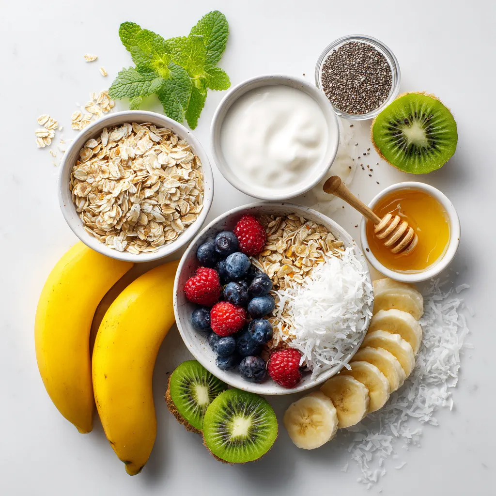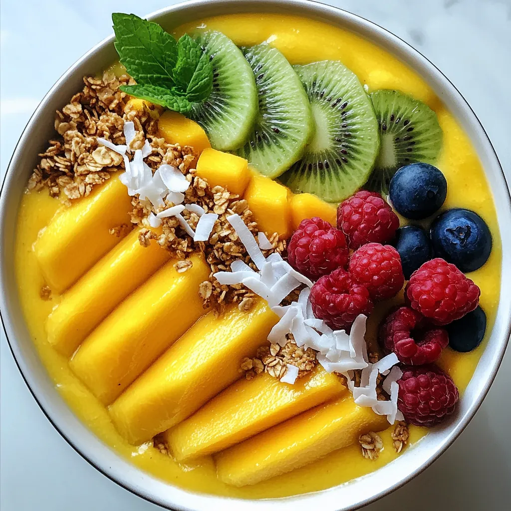 - 2 ripe mangoes, peeled and diced into bite-sized pieces - 1 medium banana, sliced into rounds - 1 cup coconut milk or almond milk - 1/2 cup Greek yogurt or dairy-free alternative - 1 tablespoon honey or maple syrup - 1/4 cup rolled oats - 1 tablespoon chia seeds - Sliced kiwi - Shredded coconut - Granola - Fresh mixed berries like strawberries and blueberries - Mint leaves In this Tropical Mango Smoothie Bowl, the main ingredients shine. I use two ripe mangoes for sweetness. Their bright color and flavor remind me of sunny beaches. I slice a banana to add creaminess and extra sweetness. Next, I choose coconut milk for its rich taste, but almond milk works too. Greek yogurt gives it a nice texture, but you can use dairy-free yogurt if needed. Optional ingredients help you customize your bowl. Honey or maple syrup adds sweetness if you prefer it. Chia seeds and rolled oats boost nutrition and texture. They give your smoothie a nice body and help you feel full longer. Toppings make your bowl fun and pretty. I love adding sliced kiwi for a burst of green. Shredded coconut brings a tropical crunch. Granola adds some crunch too, while fresh mixed berries add color and flavor. Finally, I sprinkle mint leaves on top for a fresh touch. You can mix and match your toppings for a unique creation. {{ingredient_image_2}} - Start by taking 2 ripe mangoes. Peel and dice them into small pieces. - Next, slice 1 medium banana into rounds. - Add the mangoes and banana to a blender. - Pour in 1 cup of coconut milk or almond milk. - Add 1/2 cup of Greek yogurt or your favorite dairy-free yogurt. - If you like it sweet, add 1 tablespoon of honey or maple syrup. - Blend on high until smooth and creamy. Scrape the sides as needed. - Now, sprinkle in 1/4 cup of rolled oats and 1 tablespoon of chia seeds. - Pulse the blender a few times to mix them in. This makes your smoothie thicker. - Blend until you reach your desired consistency. It should be thick but pourable. - Carefully pour your smoothie mixture into a bowl. - Use a spatula or spoon to smooth the top. This helps make it look nice for toppings. - For toppings, arrange sliced kiwi on top of the smoothie. - Next, sprinkle some shredded coconut over the kiwi. - Add a handful of your favorite granola for crunch. - Scatter fresh mixed berries like strawberries and blueberries on top. - Finish with a few mint leaves for a pop of color. To pick ripe mangoes, look for those that yield slightly to gentle pressure. They should feel firm but not hard. Also, check for a sweet aroma near the stem. Sweetness is key in mangoes. A ripe mango is not just soft; it has a rich, sweet flavor that makes your smoothie bowl taste amazing. You can swap coconut milk for almond milk if you prefer a nutty taste. For sweeteners, honey or maple syrup are great options, but you can skip them if your mangoes are sweet enough. Get creative with your toppings! Try sliced banana, nuts, or even a sprinkle of cinnamon for a unique twist. Adding protein can make your smoothie bowl more filling. You can mix in protein powder or nut butter for a boost. For extra nutrition, consider adding superfoods like spirulina or flax seeds. They add health benefits without changing the taste much. Enjoy making it your own! Pro Tips Choose Ripe Mangoes: For the best flavor, select mangoes that are slightly soft to the touch and have a sweet aroma. This ensures your smoothie bowl will be naturally sweet and delicious. Customize Your Milk: You can use coconut milk for a tropical twist, but almond milk or any other plant-based milk will work well too. Adjust based on dietary preferences or availability. Incorporate Protein: If you're looking to make the smoothie bowl more filling, consider adding protein powder or extra Greek yogurt to boost its nutritional value. Experiment with Toppings: Feel free to mix and match your toppings! Try adding nuts, seeds, or even a drizzle of nut butter for extra texture and flavor. {{image_4}} You can mix in other fruits for fun flavors. - Try adding pineapple for a tangy taste. - Papaya blends well and adds creaminess. - Berries like strawberries or blueberries give a sweet boost. Mixing fruits can change the flavor and texture. It also keeps your smoothie bowl exciting. Use whatever you find in your kitchen. Get creative and make it yours! Themed smoothie bowls can be a treat for your eyes and taste buds. - A tropical twist is easy with coconut and lime. - For a berry-blast, use a mix of different berries. These themes add variety to your smoothie bowl. You can switch them up to match your mood or the season. Each bowl can tell a story, based on what you choose! Fruits change with the seasons, and so can your smoothie bowl. - Use fresh fruits based on what is in season. - In winter, try adding warm spices like cinnamon. Seasonal ingredients keep your smoothie bowl fresh and exciting. They also support local farmers and reduce waste. Adjusting your recipe can help you enjoy different flavors all year round! Can you store the smoothie mixture? Yes, you can store it. I recommend blending the smoothie and pouring it into a jar. Seal it tightly and place it in the fridge. Consume it within 24 hours for the best flavor. Best practices for storage include keeping it in a glass container. This helps maintain freshness. Avoid using metal containers, as they can alter the taste. Always shake or stir before drinking. What can you do with leftover smoothie? You can freeze it in ice cube trays. This makes a great addition to future smoothies. You can also pour it into popsicle molds. Freeze them for a refreshing treat later. The shelf life of ingredients varies. Fresh mango and banana last about 3 days in the fridge. Coconut milk can last a week after opening. Greek yogurt usually keeps for about 1-2 weeks. How do you freeze banana and mango? Peel and slice the banana. Cut the mango into cubes. Place them in a single layer on a tray and freeze. Once frozen, transfer them to a zip-top b