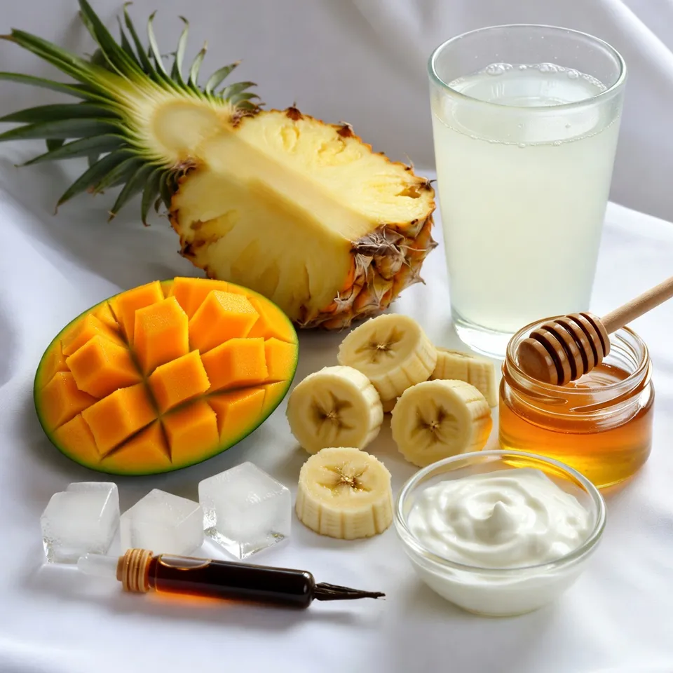 Start by getting your ingredients ready. You need one ripe mango, one cup of fresh pineapple, one medium banana, one cup of coconut water, half a cup of Greek yogurt, one tablespoon of honey, half a teaspoon of vanilla extract, and ice cubes.