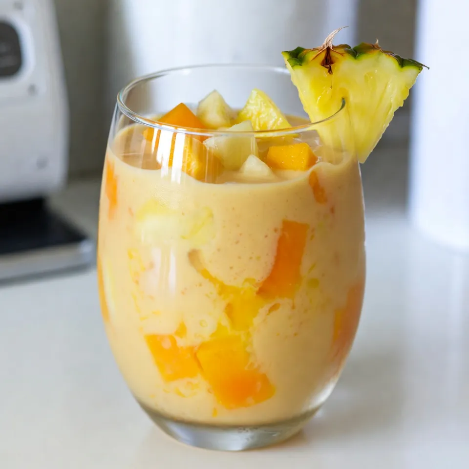 A refreshing and creamy smoothie made with ripe mango, fresh pineapple, banana, and coconut water, perfect for a tropical treat.